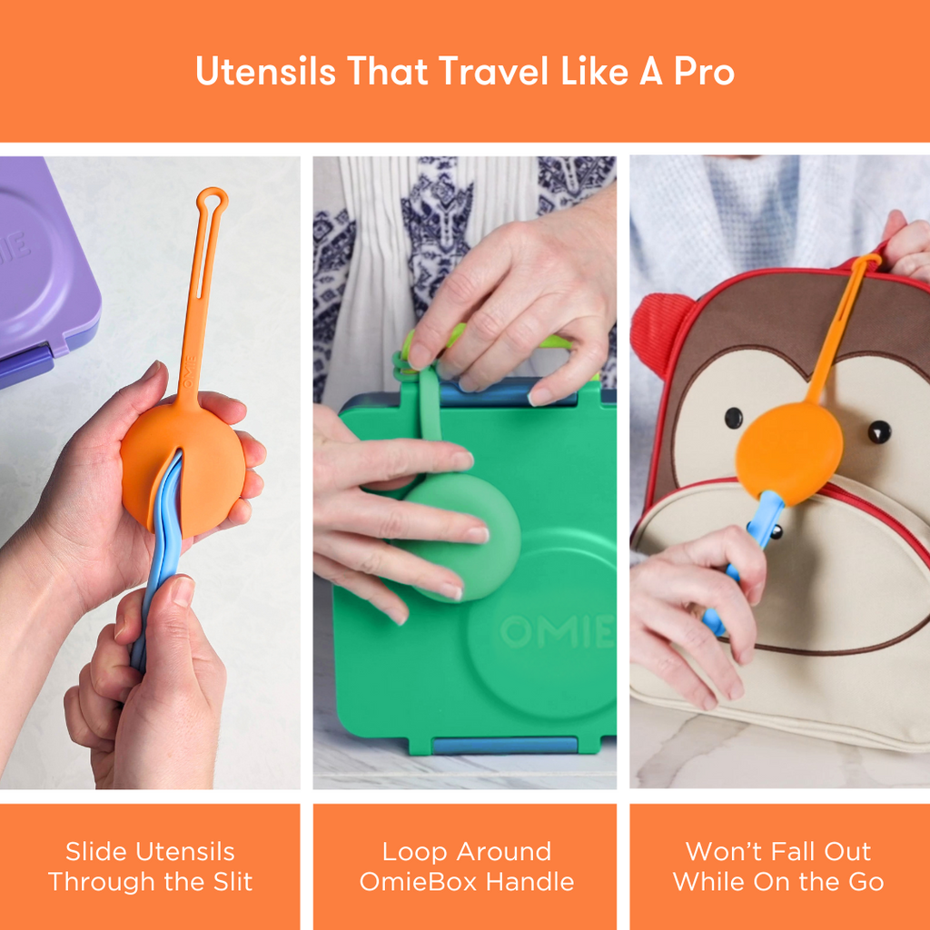 OmiePod is a fun, easy way to carry utensils with your OmieBox®. It loops around the handle and has a clever back slit, so kids can slide utensils in and out with no fuss.